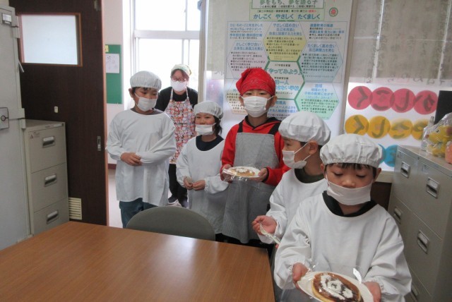 「パンケーキ作りました。「ほっかほかのパンケーキだよ。」
