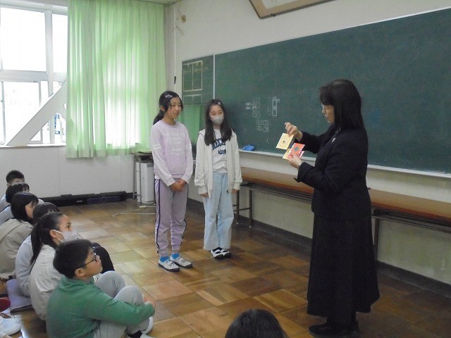 6年生は、学校の「交通安全リーダー」となります。主任の先生からその心得についてお話を聞き、校長先生からリーダーワッペンを授与していただきました。