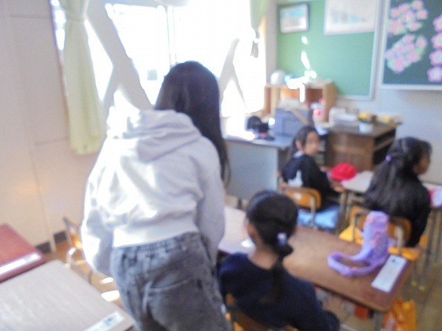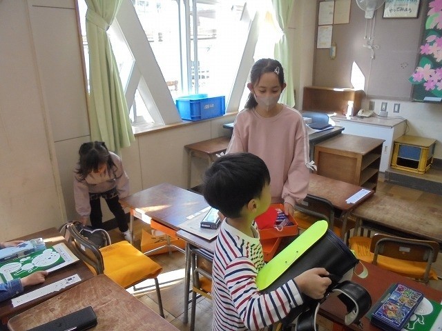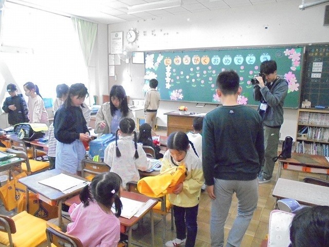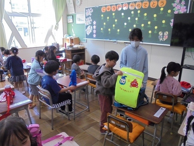 6年生が朝の支度の見守りに来てくれました。6年生は「やってあげる」のではなく、1年生が自分でできるように「見守り」、分からないことは「教える」という姿勢でサポートしていました。3日間で、自分で考えてできる子がとても増えました。来週からも頑張れそうです。