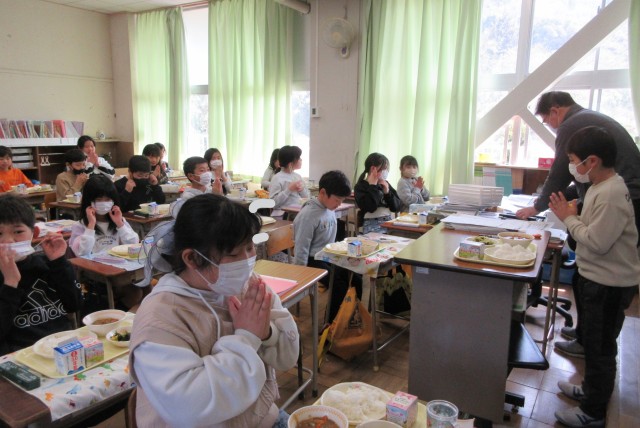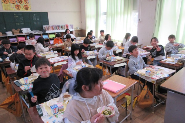 今年度最後の給食でしたが、元気な3年生は「おいしい」とカレーを頬張っていました。