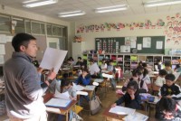 算数の時間です。大きく映し出された○のかずと同じ数字をかきます。
