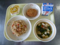 今日の献立は、ごはん、牛乳、鶏肉とじゃがいもの揚げ煮、わかめスープ、りんごでした。
