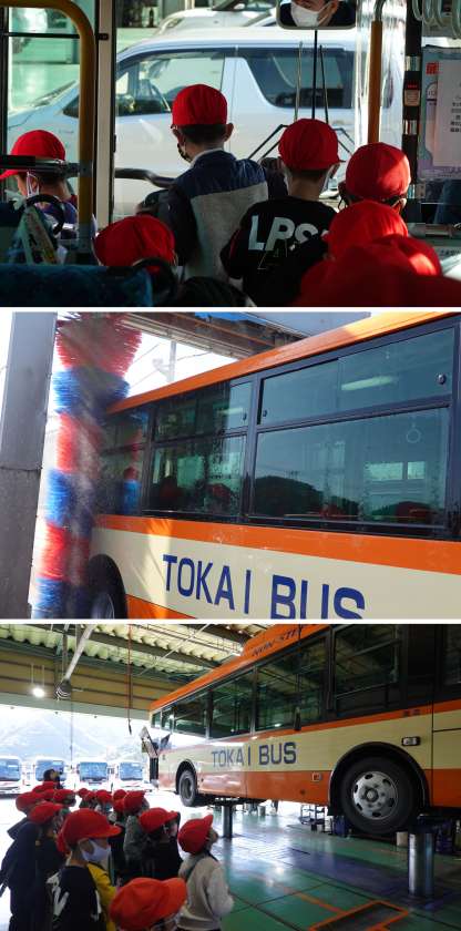 また東海バスさんのご厚意で、洗車機の体験や整備工場の見学も行うことができました。