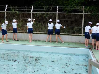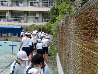 プールのフェンスにからまるつたや葉を取り除くのに苦労しました。
