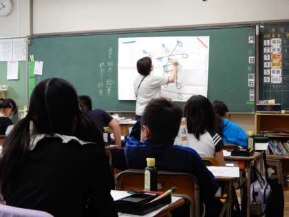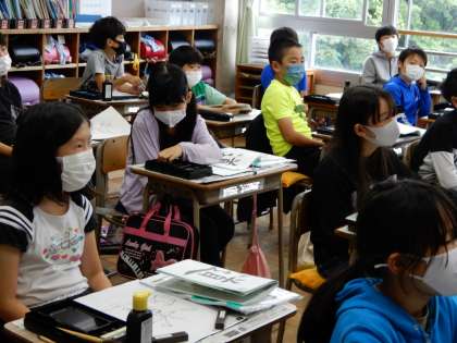 毛筆の授業では、「とめ」「はらい」等の説明をしっかりと聞きました。