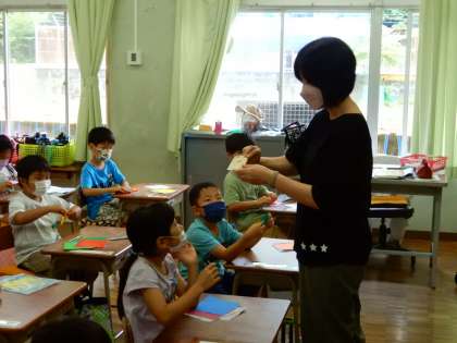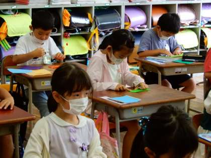 図工の授業で、先生の説明をしっかりと聞いて作業に取りかかっています。