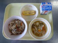 11月6日の給食は、すき焼き風炊き込みご飯、牛乳、かつお入り厚焼き玉子、いも団子...