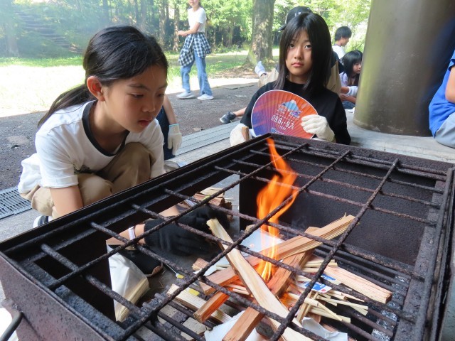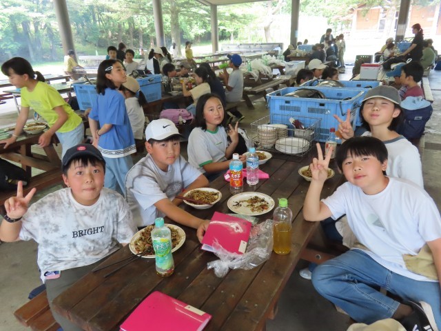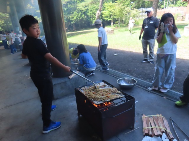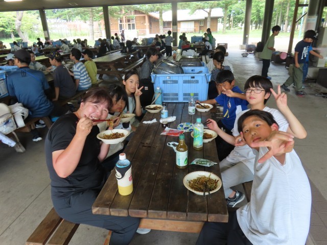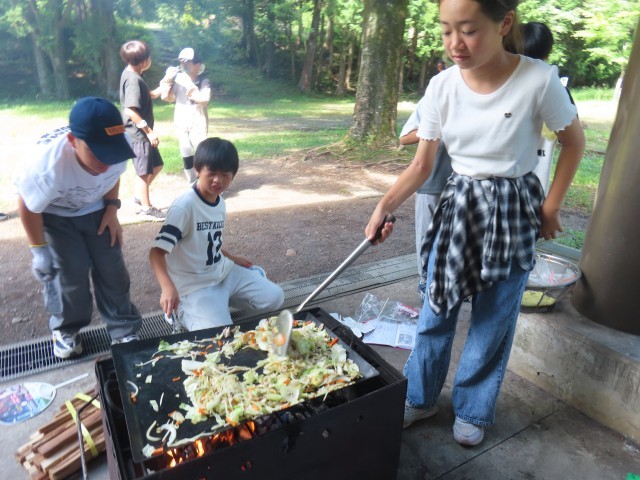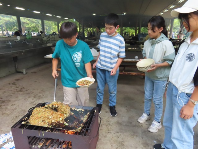 二日目は、朝のラジオ体操から始まりました。そのあと、朝ご飯を食べて野外炊事へ。自分たちで火をおこして、焼きそばを作ることができました。火が強すぎて焦げてしまっても、みんなおいしく食べていて最高の思い出になりました。