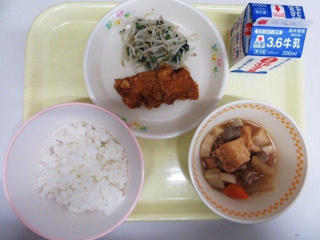 今日の献立は、米飯 牛乳 いかの更紗揚げ もやしのごま塩あえ さといもと生揚げの旨煮 です。