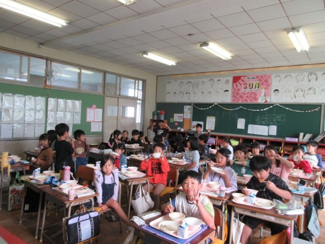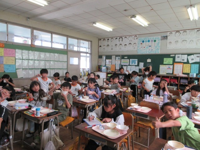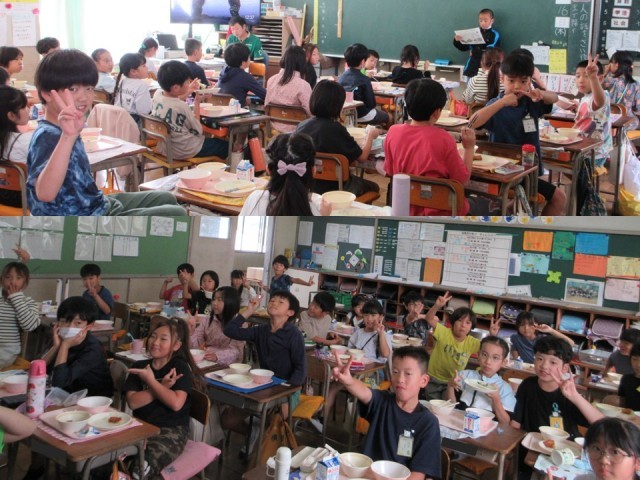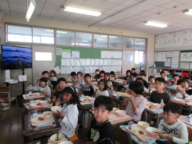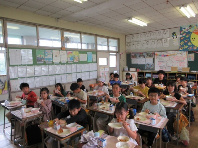 写真は、「ドラゴンからのちょうせんじょう」に挑戦したり、よくかんでよく味わって食べたりして、充実した給食時間をすごしている3年生です。