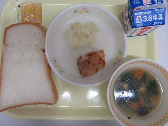 今日の献立は、山型食パン 牛乳 鶏肉のチリソース焼き こふき芋 ベーコンと野菜のスープ です。