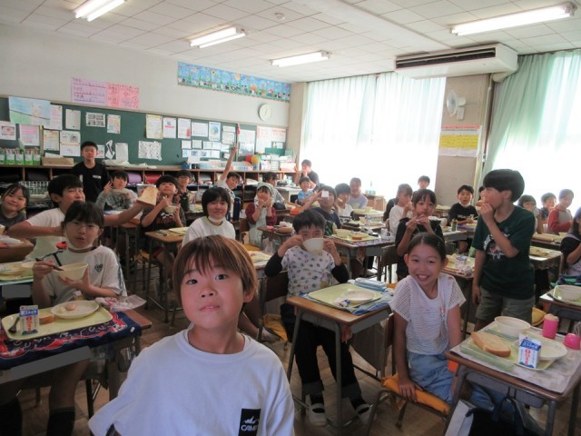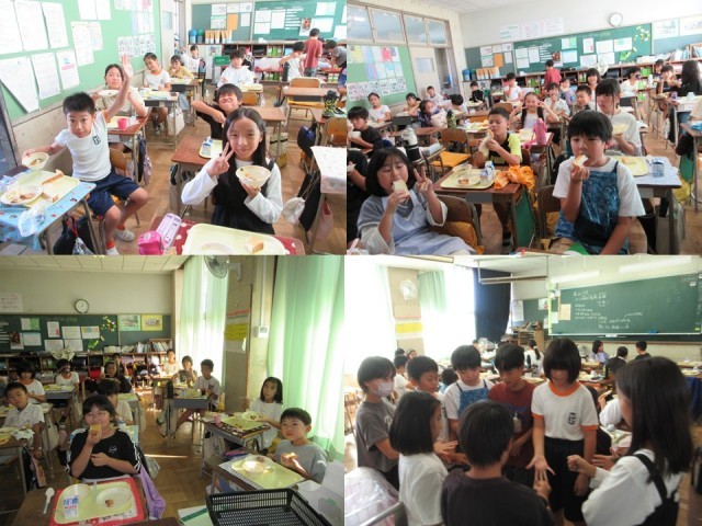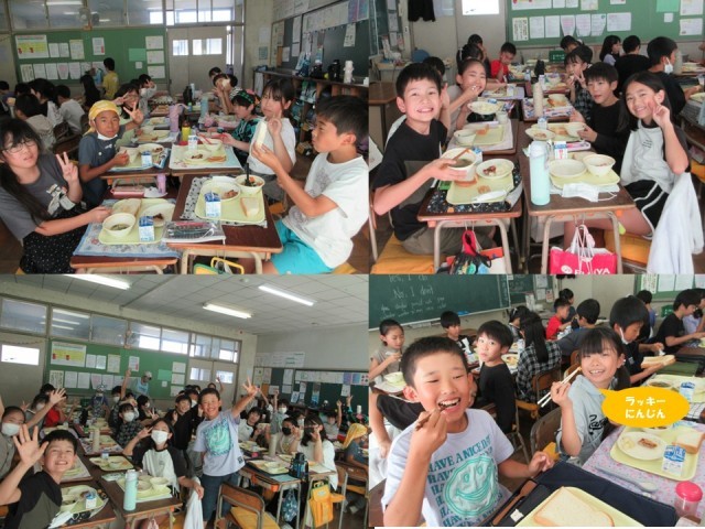 写真は、おかわりじゃんけんで盛り上がったり、ラッキー人参を見つけたり、楽しい給食時間をすごしている4年生です。