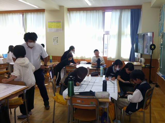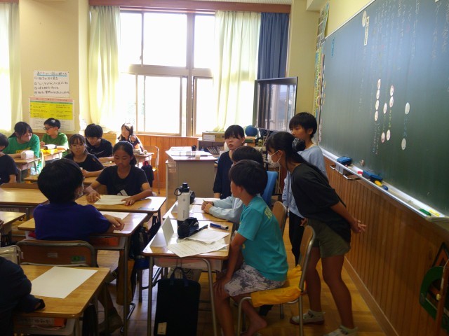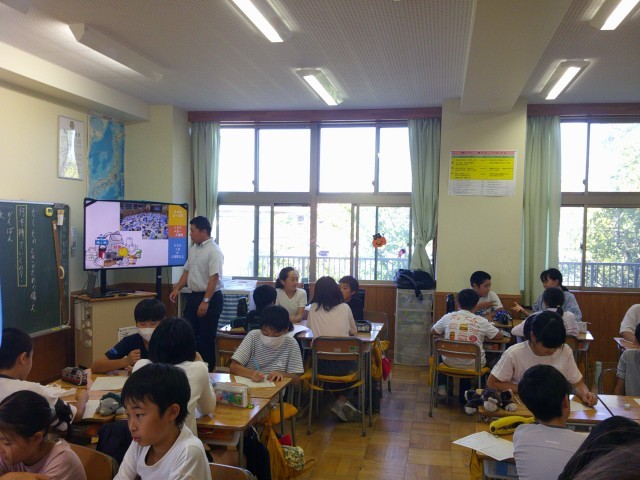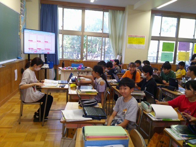 5年生は4組が社会、3組は総合、2組は学活、1組は読解です。自分で学ぶ場面と、友達と協力して、折り合いを付けながら学習する場面と、成長した様子を見ていただきました。