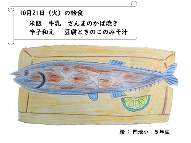 秋の味覚「秋刀魚」の素敵なイラストは、5年生が描いてくれました。
