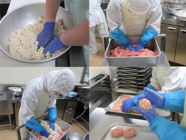 写真は、豆腐ハンバーグを作っている様子、おかわりじゃんけんで盛り上がっている明るく元気な5年生です。