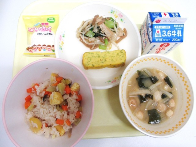 今日は、 秋の香りごはん 牛乳 厚焼き玉子 煮びたし 大根とわかめのみそ汁 バニラ大福 少し早い十三夜(11月2日)献立です。