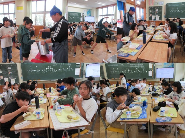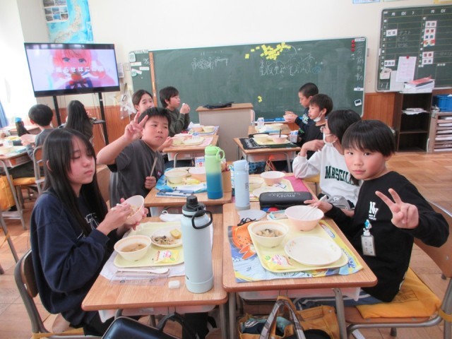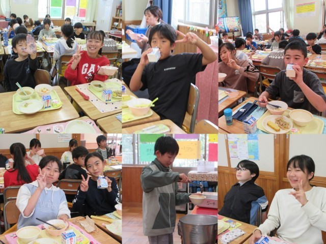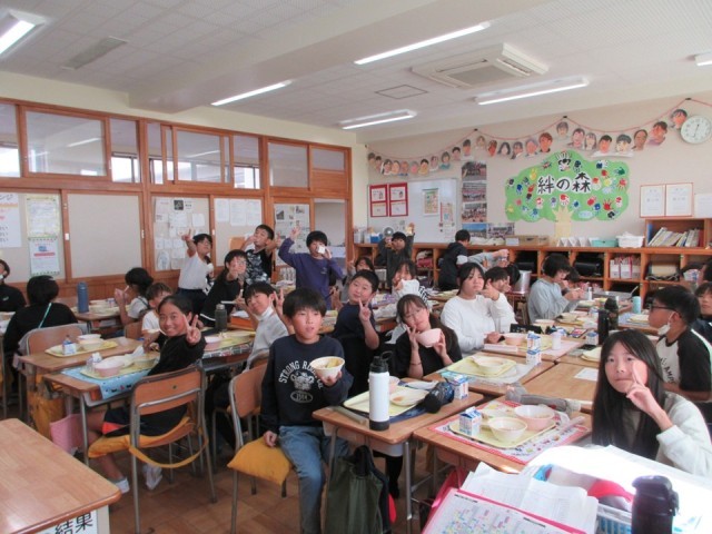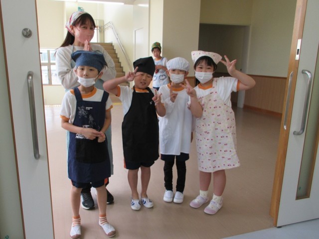 写真は、きちんと身支度をして配膳室にワゴンをとりにきてくれた笑顔の7組さんと、おかわりもして、今日も「おいしー(C)」のポーズをきめてくれた明るい5年生です。
