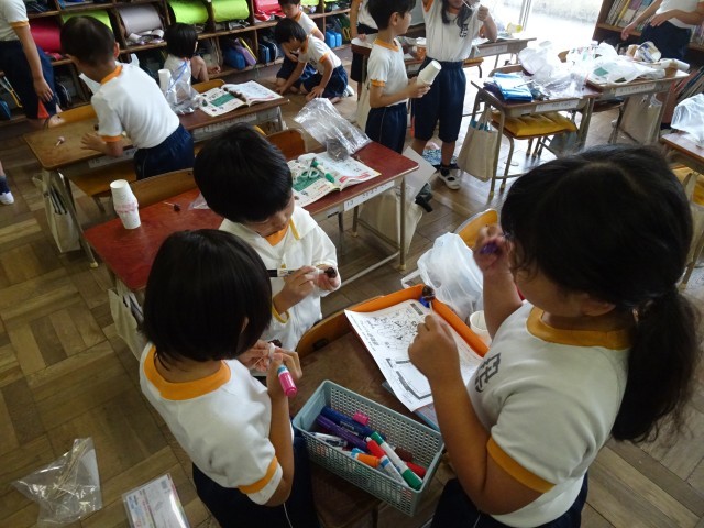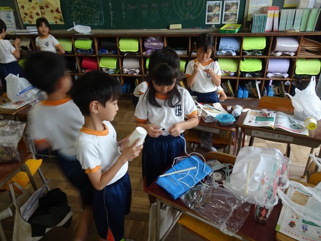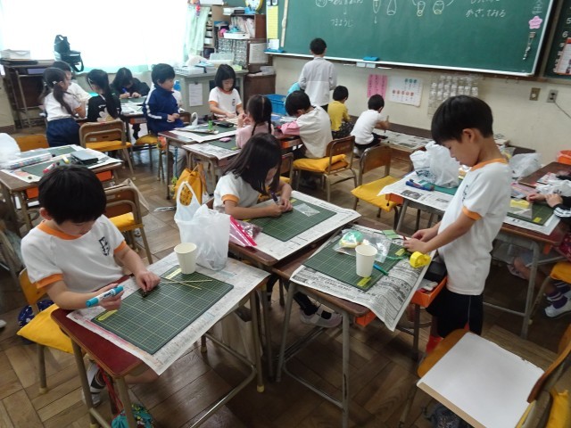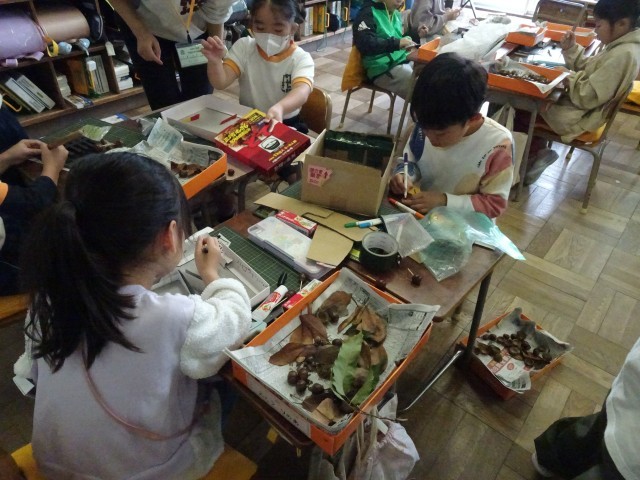 先日 門池公園で見付けたどんぐりや落ち葉などを使って、子供たちがおもちゃづくりを始めました。
