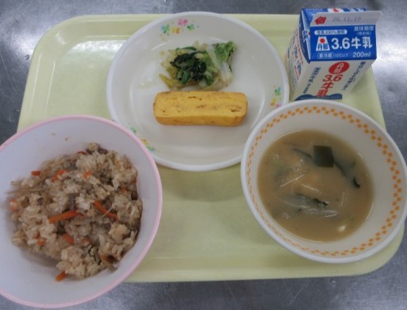 今日の献立は、すきやきふう炊き込みごはん 牛乳 鰹入り卵焼き ごま入りおひたし だいこんと豆腐のみそ汁 です。