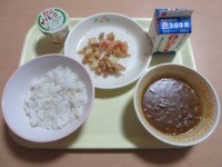 今日の献立は、揚げパン 牛乳 ポトフ 茎わかめのサラダ アーモンドフィッシュ です。
