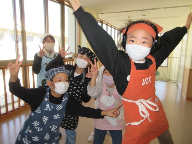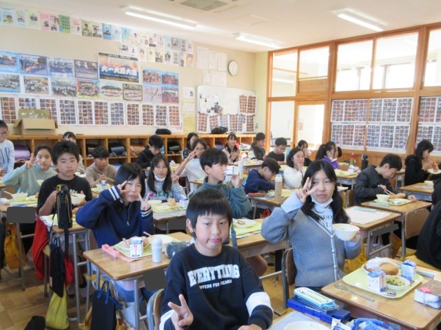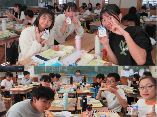 写真は、配膳室にワゴンをとりにきてくれた元気いっぱいの4年生 と 寒くなってきましたが0牛乳もしっかり飲んで楽しく食事をしている6年生です。
