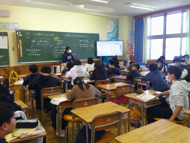 今日は研修のため、4時間授業でした。その4時間目、1組は家庭科、2組は理科、3組は社会、4組は音楽の授業でした。友達の考えに耳を傾けたり、自分の考えを発表したり、1人では難しいことも友達と協力することでできたり、短い1日も充実していました。