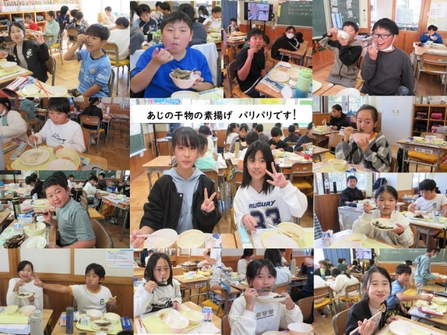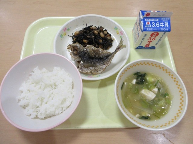 今日の献立は、米飯(するがの極)牛乳 鯵の干物の素揚げ ひじきと大豆の炒め煮 白菜と豆腐のみそ汁 です。
