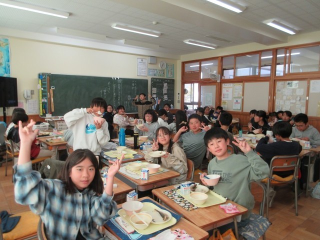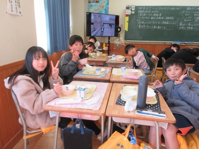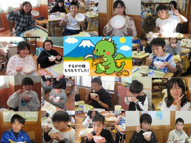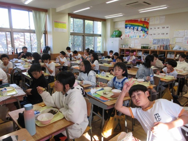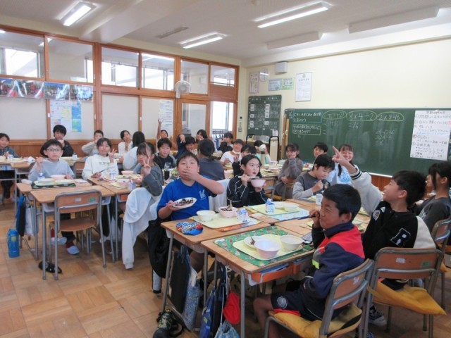 写真は、ふるさとの味 「駿河の極」 や 「鯵の干物」 をじっくりと味わって食べている明るく元気な5年生です。