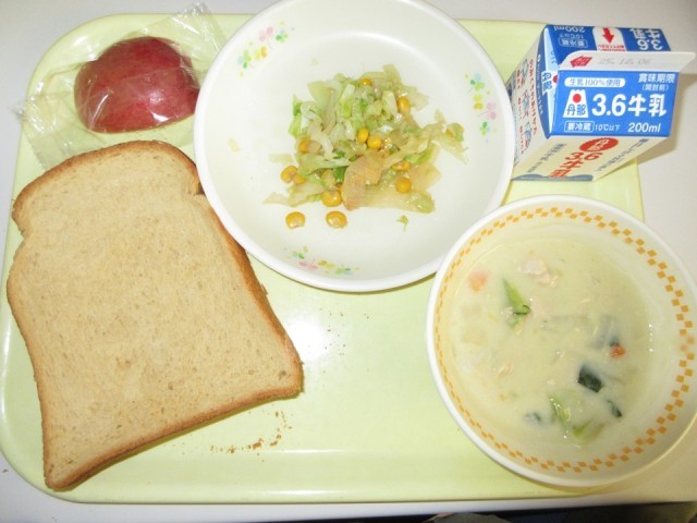 今日の献立は、黒糖入り山型食パン 牛乳 クリームシチュー こんにゃくサラダ りんご です。