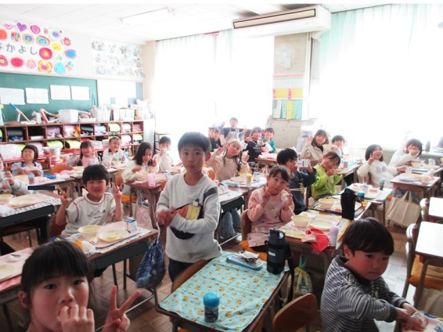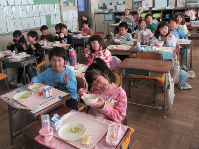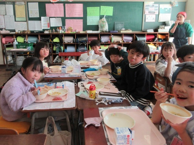 写真は、収穫したさつまいも入りのシチューをおいしそうに食べている可愛い1年生です。