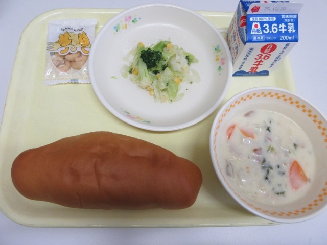 今日の献立は、黒糖入りロールパン 牛乳 かぶのクリーム煮 花野菜のソテー カシュ―ナッツ です。