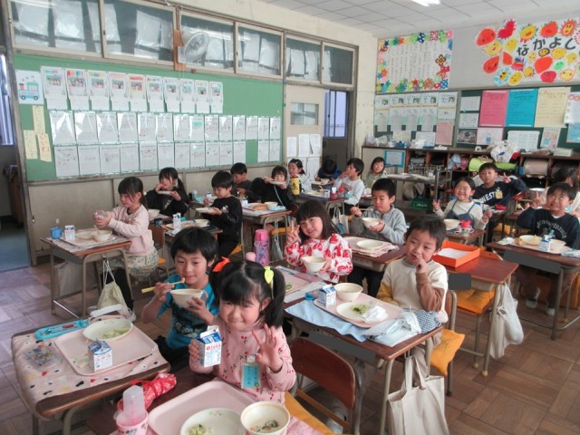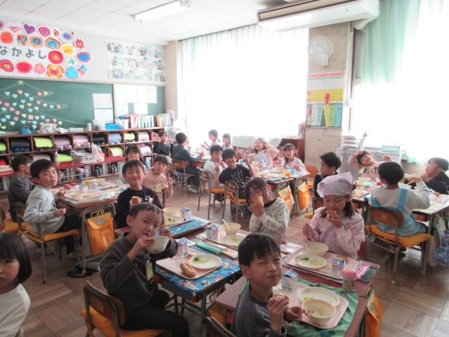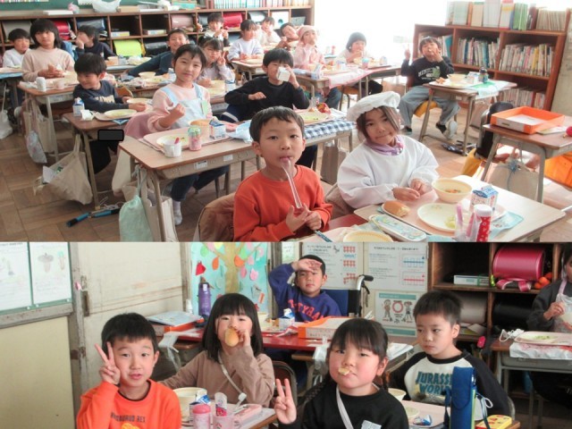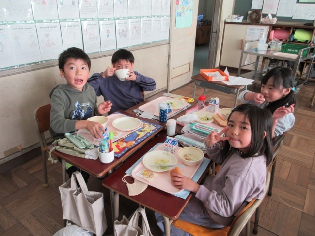 写真は、笑顔で食事をしている明るく元気な1年生です。