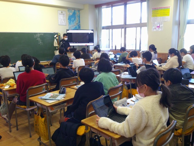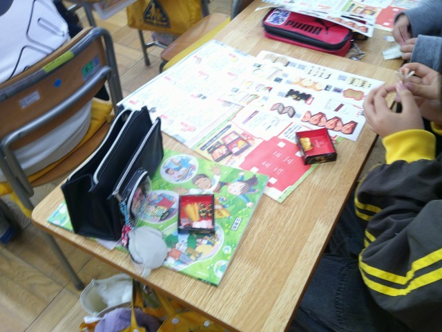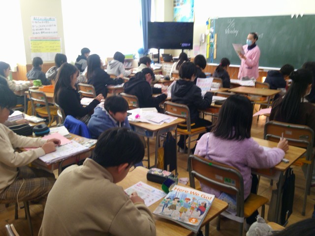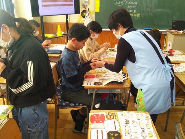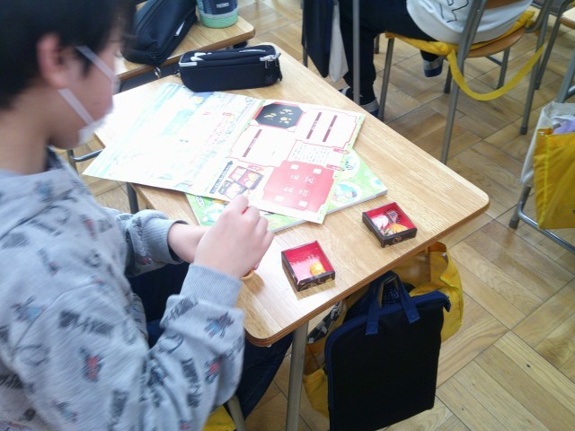 今日の2時間目です。4組は図工、3組は理科、2組は英語、1組は家庭科でした。家庭科の授業には、栄養士の横田先生も授業に加わり、おせち料理について学びました。ミニチュアのおせち料理を作りながら、1つずつ、料理に込められる願いを教えてもらいました。