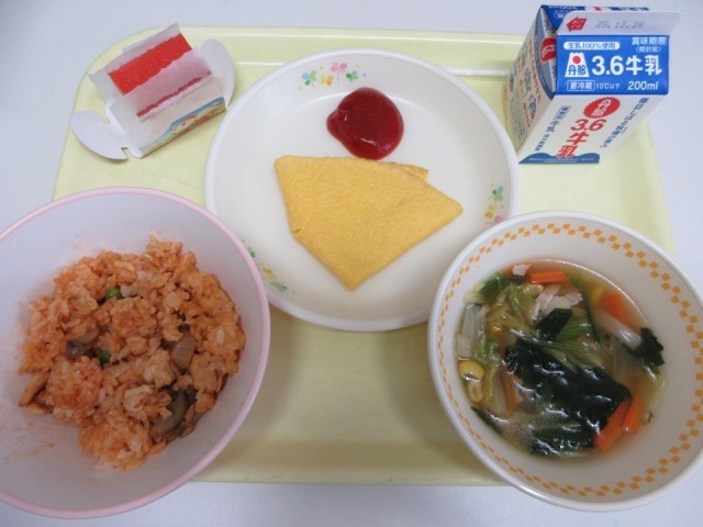 今日の献立は、オムライス(ケチャップライス 薄焼き卵 トマトケチャップ) 牛乳 白菜スープ いちごケーキ です。