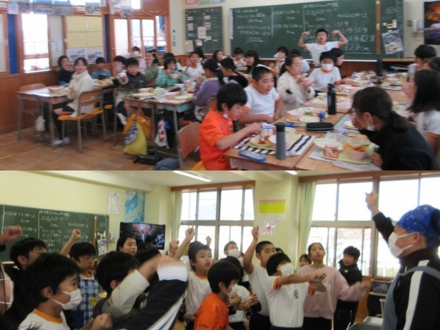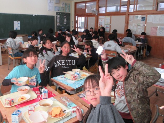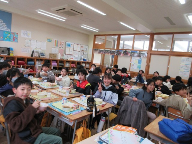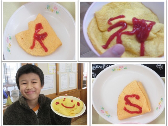 写真は、可愛いオムライスを作ったり、おかわりじゃんけんでもりあがったり、牛乳パックのチェックしたり、給食時間を楽しんでいる5年生です。