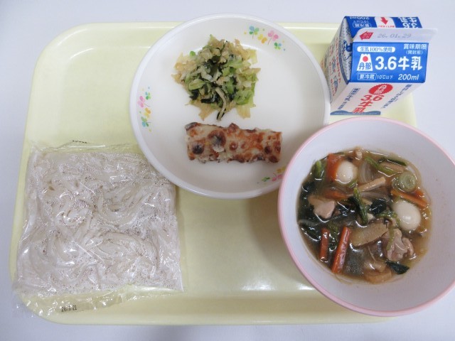 今日の献立は、うどん 牛乳 あんかけうどん汁 ちくわのてんぷら キャベツとわかめのすのもの です。