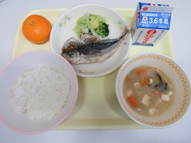 今日は、6年生作成献立 米飯 牛乳 あじの干物の素揚げ カリフローレとブロッコリーのサラダ 根深葱と木耳のみそしる みかん です。