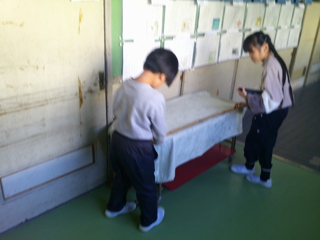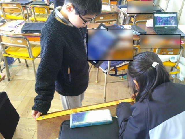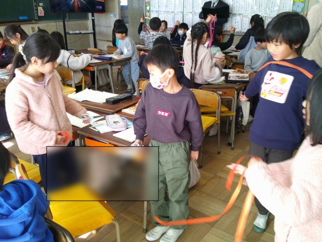 2年3組の算数の授業です。紙テープを1メートルの長さを予想して切ったり、1メートルものさしで教室にある物を協力して計ったりして、1メートルの長さを体感していました。