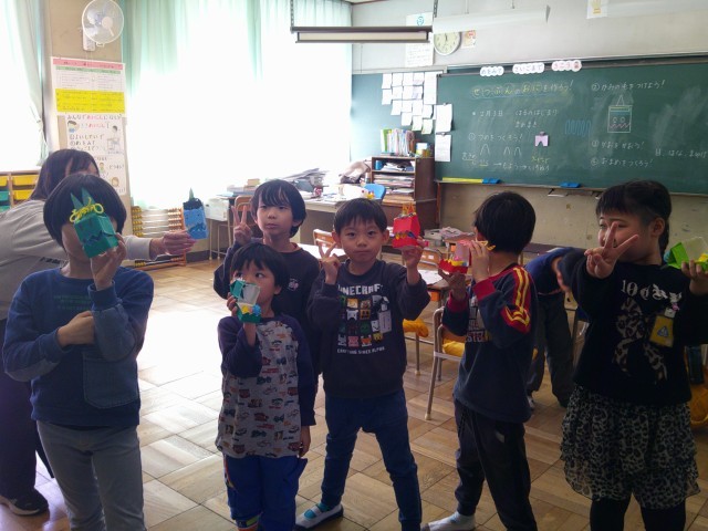 7-1組のみんなです。節分の日に、牛乳パックを使って、鬼の顔を作りました。口をあけると、中に手作りお豆がいっぱい入っていました。