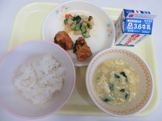 今日の献立は、米飯 牛乳 油淋鶏 カクテキ 卵と春雨のスープ です。