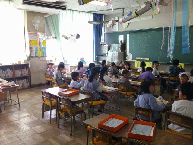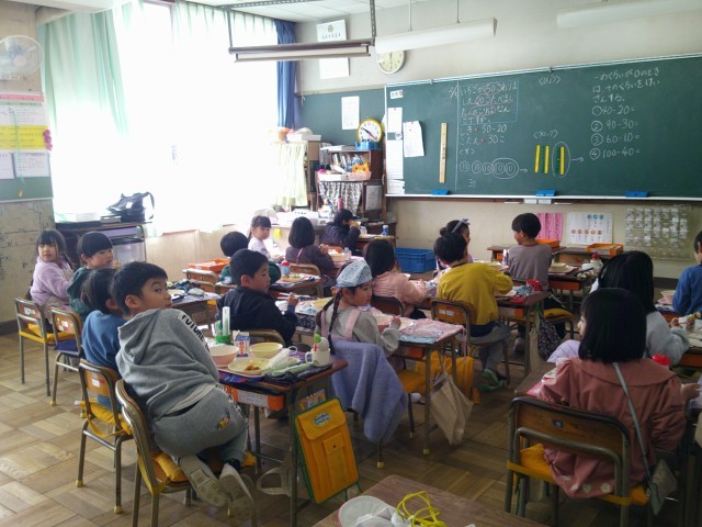 今日の給食は、ユーリンチーにカクテキ、たまごスープでした。大好きなメニューなのか、おいしそうに食べていました。
