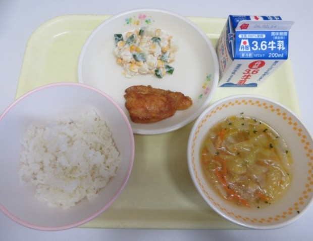 今日の献立は、ガーリックライス 牛乳 タンドリーチキン マセドアンサラダ はくさいのスープ です。