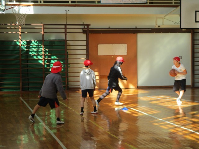 今日の体育では、バスケットボールの2対2の練習です。