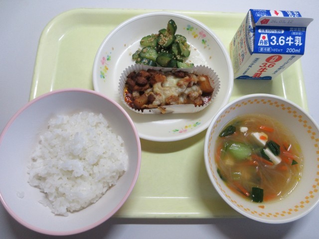 今日の献立は、米飯 牛乳 チーズタッカルビ 野菜のピり辛あえ 春雨スープ です。