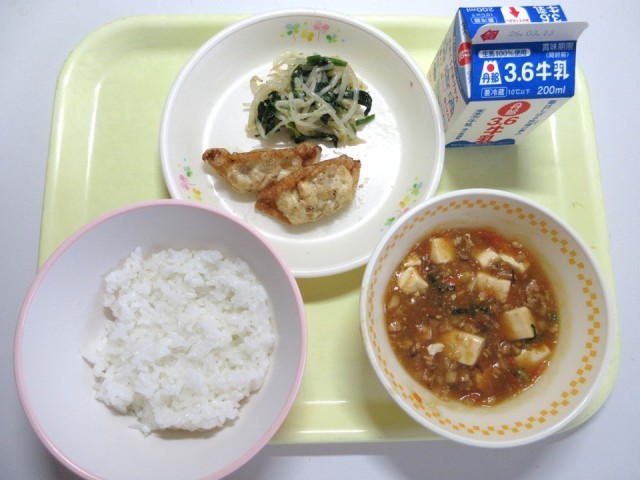 今日の献立は、米飯 牛乳 麻婆豆腐 揚げ餃子 ナムル です。