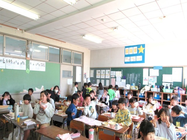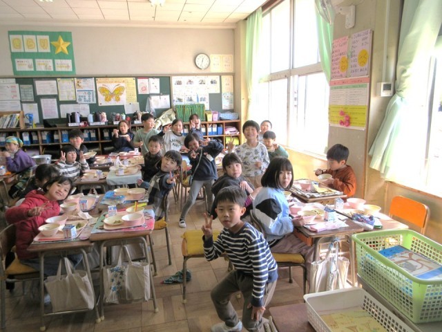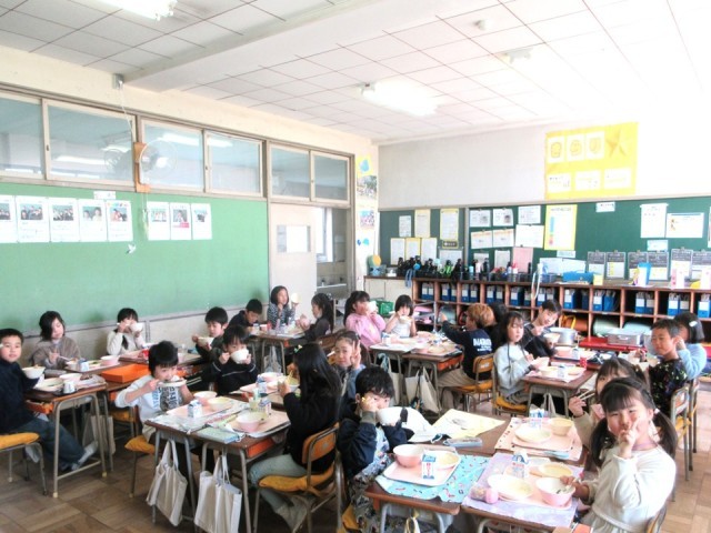 写真は、具沢山みそ汁を考案した6年生と笑顔いっぱいの2年生の給食時間です。
