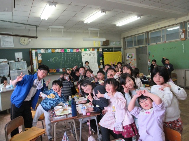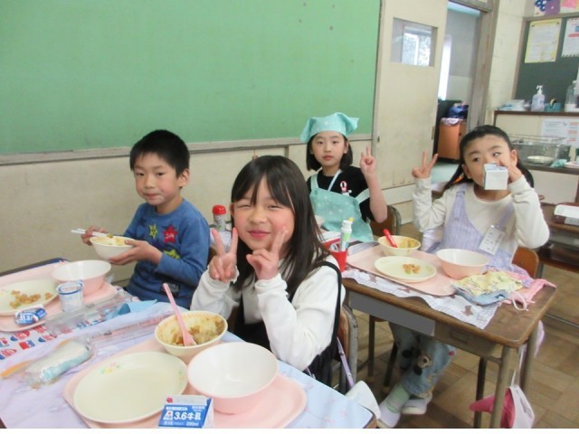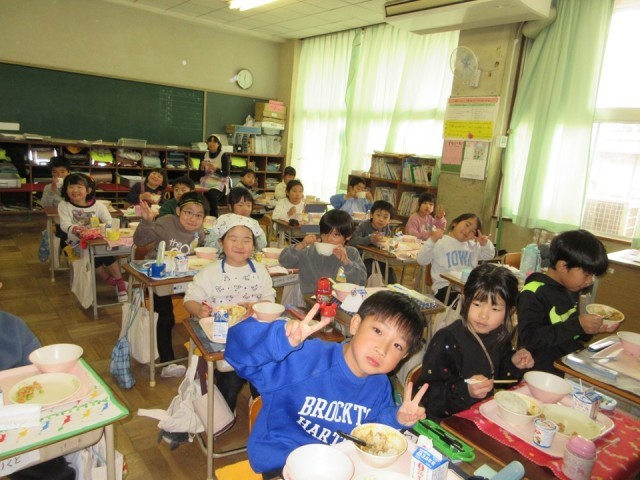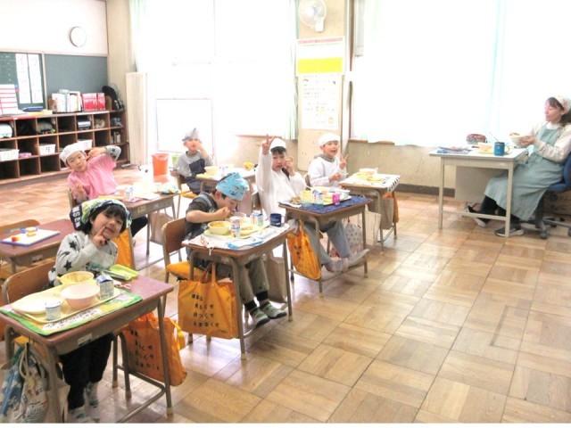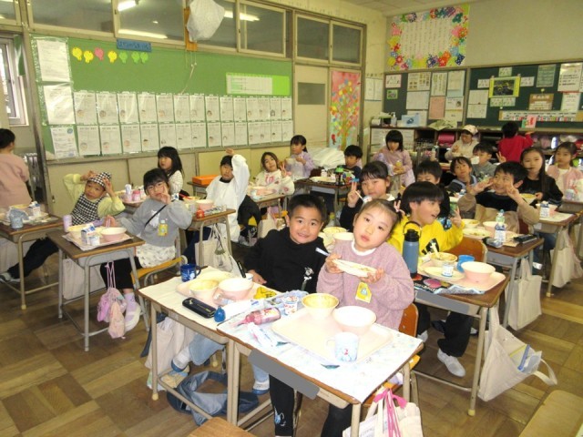 写真は、クラスで楽しい給食時間をすごしている 1年生と7組のみなさんです。