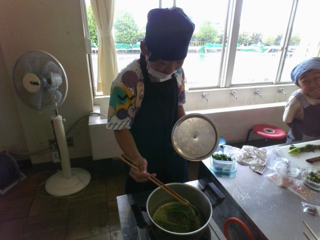 2時間目の家庭科の授業の様子です。初めての調理実習でほうれん草をゆでました。とてもおいしかったそうです。
