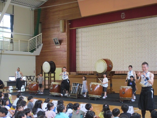午前中は1年生から3年生と7組が鑑賞しています。写真は練習の風景と代表者の子どもたちが太鼓をやっている様子です。