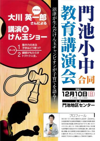 講演とけん玉ショーがあります。講演は、「集中力のある